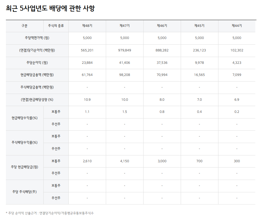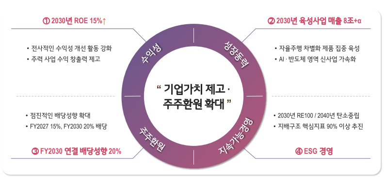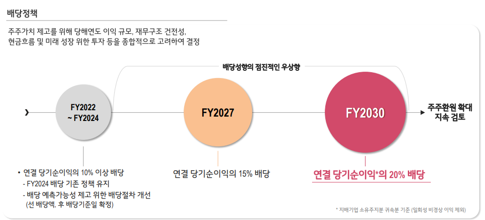 이후 2027년에는 연결 당기순이익의 15%를 배당할 예정이며, 2030년에는 연결 당기순이익의 20%를 배당할 예정입니다. 점진적인 배당성향의 우상향을 통해, 주주환원에 힘쓰고자 하는 점을 엿볼 수 있는 부분입니다.