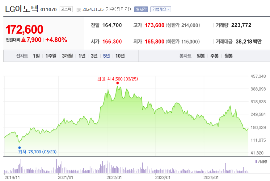 LG이노텍의 주가는 '21년까지 상승하다가, '22년부터 실적이 하락하며, 주가 역시 하향세를 그리고 있습니다. 아직까지는 특별한 상승 모멘텀이 없는 상황으로, Apple의 신제품 출시와 맞물려 실적 및 주가가 개선될 수 있을지 지켜봐야 하겠습니다.