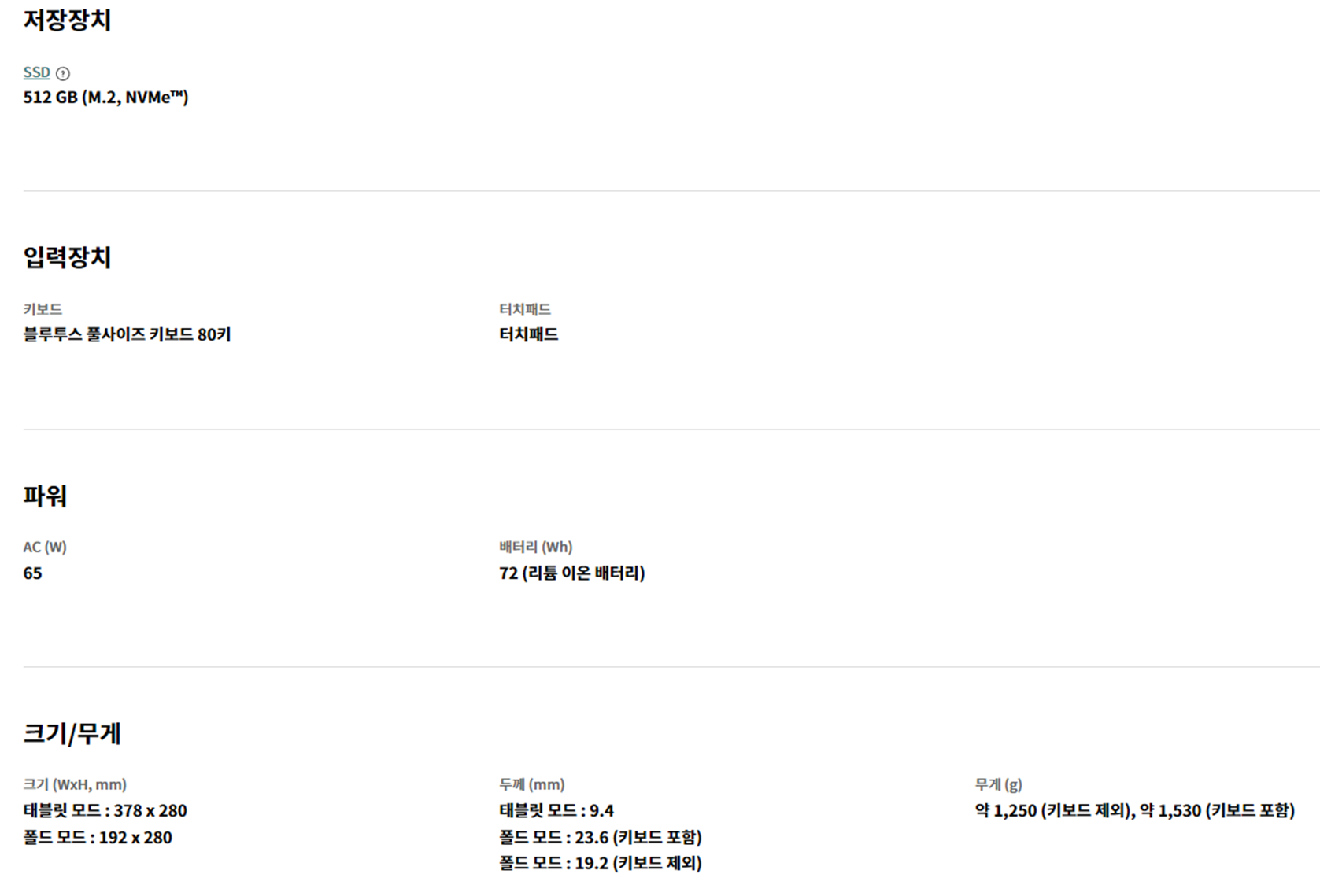 무게 : 약 1.25kg(키보드 제외) / 1.53kg(키보드 포함)