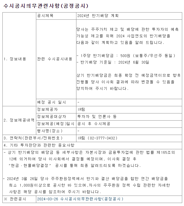 2024년 반기 배당 배당주/배당금 기업 완전 정복!(분기 배당, 중간 배당, 배당 결정 및 공시, 배당