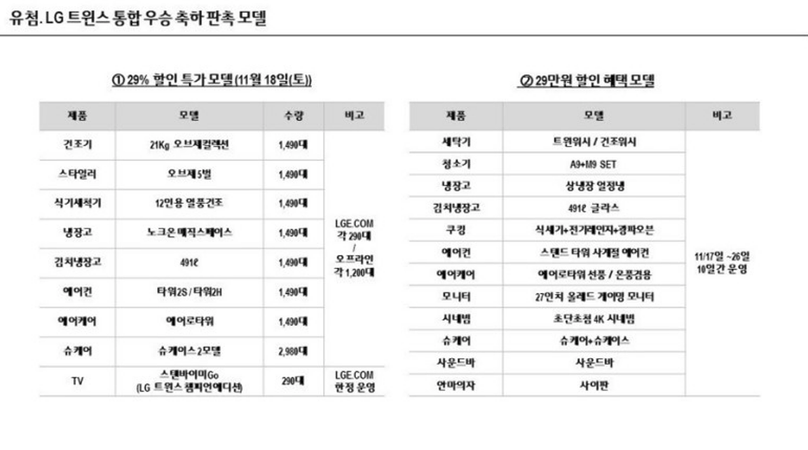 | LG트윈스 우승 - 윈윈 페스티벌 할인 행사! (LG전자, LG생활건강, LG유플러스) (0) | 2023.11.16 |