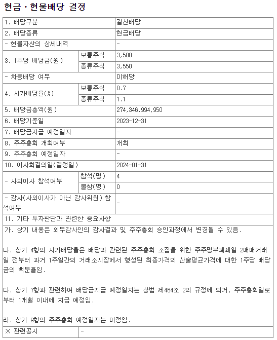 배당금 : 3,500원 (보통주) / 3,550원 (우선주)