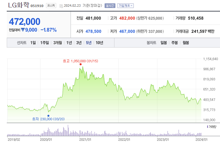 LG화학은 아쉽게도 고배당을 실시하고 있지는 않으나, 꾸준히 1%대의 배당을 실시하고 있습니다. 다만, 이번 '23년도에는 실적 부진이 겹치며 배당율이 1% 아래로 하락하였습니다.