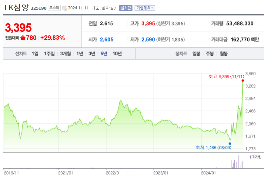 11월 11일 글 작성일 기준, LK삼양의 주가는 상한가를 달성했습니다. 이는 머스크가 이끄는 우주항공기업 스페이스X가 발사하는 위성에 LK삼양에서 개발중인 심우주 항법용 차세대 별추격기를 탑재해 우주 환경시험을 할 예정이라는 사실이 부각 받아서입니다. 다만, 이러한 테마주는 주가의 변동성이 크니 투자에 유의해야 하겠습니다.