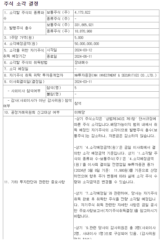 * 2024-03-12 ~ 2024-06-11 까지 3개월간 자사주 매입 후 소각 예정
