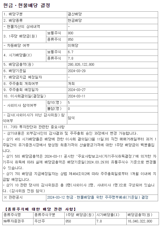 배당 조건 : 24/03/29일까지 NH투자증권 주식 보유