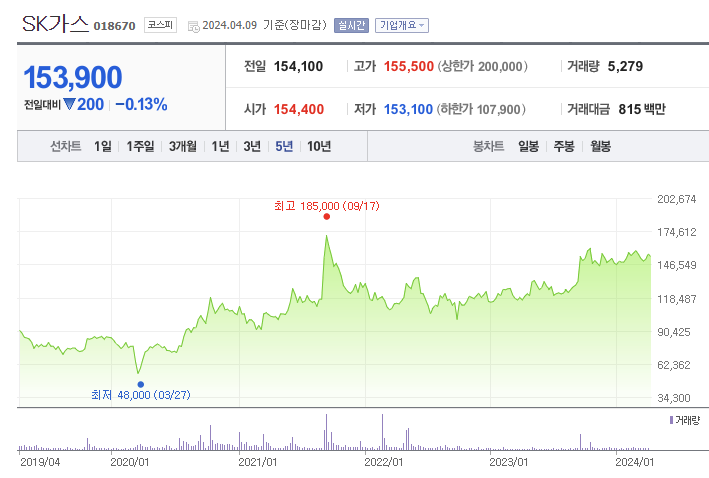 SK가스 주가 (출처 : 네이버 증권)