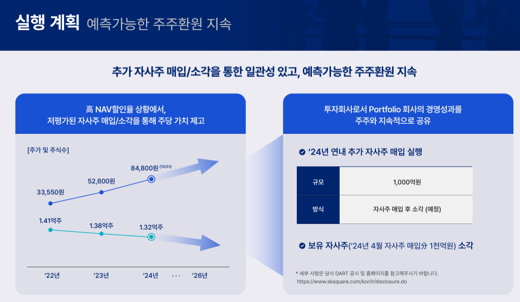 SK스퀘어는 예측가능한 주주환원을 지속해 나가고자 합니다. 올해 4월 매입한 자사주 1,000억원을 소각하고, 3개월 이내로 추가 1,000억원 규모의 자사주 매입 및 소각을 진행할 예정입니다.