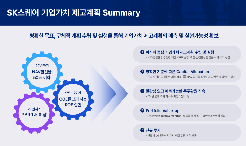 SK스퀘어는 '27년까지 NAV할인율 50%이하, COE를 초과하는 ROE 실현, 그리고 PBR 1배 이상을 기업가치 제고 목표로 설정하였습니다.