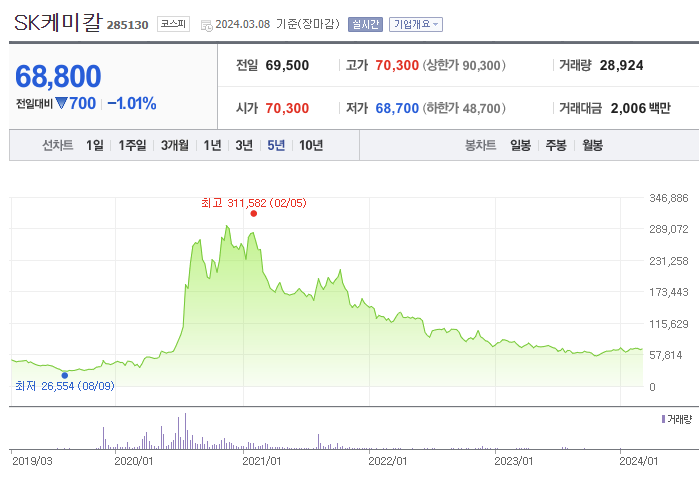 SK케미칼의 최근 5년간의 주가를 보면, 코로나 기간에 백신 개발 기대감으로 엄청나게 치솟았다가, 현재는 전고점 대비 1/5 수준의 주가를 보이고 있습니다. 아직까지는 주가 상승의 모멘텀이 보이지 않는 상황으로, 투자 고려시에는 신중해야 할 것으로 보입니다.