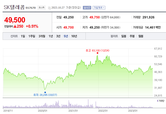 SK텔레콤의 지난 5년간 주가를 보시면, 코로나 시기에 다소 부침을 겪었으나, 대체로 변동폭이 크지 않습니다. 다만, 경기방어주이고 고배당주로써의 매력은 여전하다고 보여지며, 주가 상승을 보고 투자하는 것은 신중해야 할 필요가 있어 보입니다.
