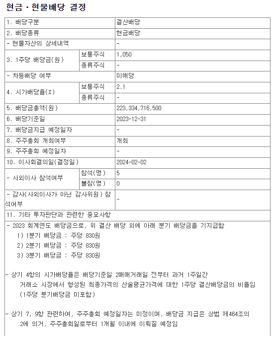 2023년 연간 배당금 (1분기, 2분기, 3분기, 결산 배당 진행)