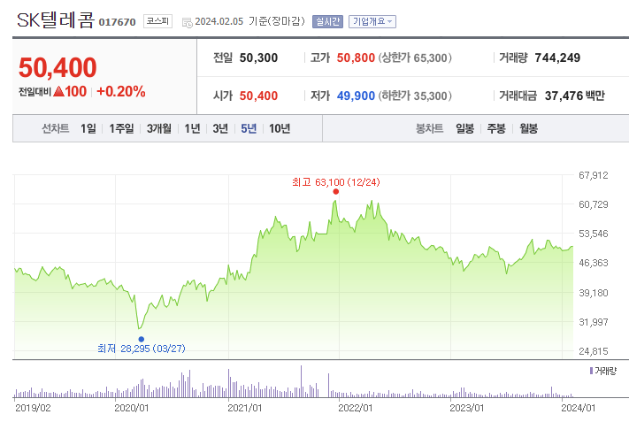 SK텔레콤의 지난 5년간 주가를 보시면, 코로나 시기에 다소 부침을 겪었으나, 대체로 변동폭이 크지 않습니다. 다만, 경기방어주이고 고배당주로써의 매력은 여전하다고 보여지며, 주가 상승을 보고 투자하는 것은 신중해야 할 필요가 있어 보입니다.