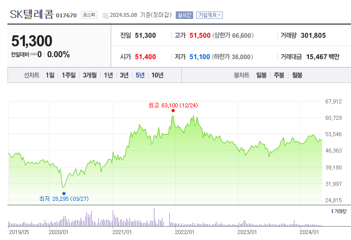 SK텔레콤의 지난 5년간 주가를 보시면, 코로나 시기에 다소 부침을 겪었으나, 대체로 변동폭이 크지 않습니다. 다만, 경기방어주이고 고배당주로써의 매력은 여전하다고 보여지며, 주가 상승을 보고 투자하는 것은 신중해야 할 필요가 있어 보입니다.