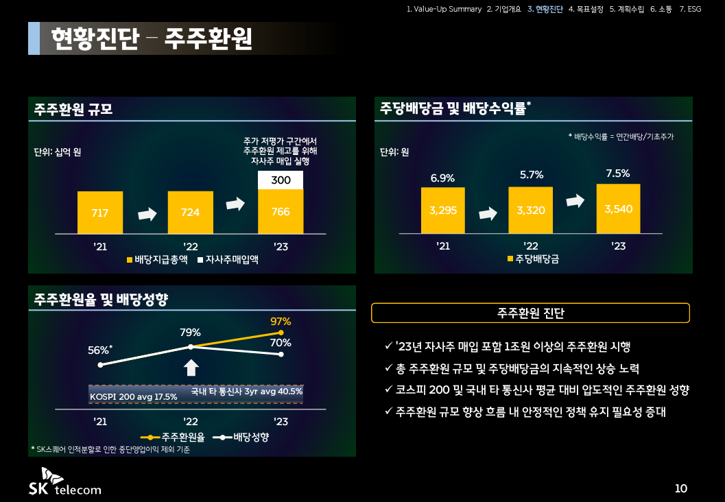 SK텔렠콤은 10월 24일, 기업가치제고계획 (밸류업)을 발표하였습니다. SK텔레콤은 현재도 고배당주로 분류되며, 주주환원에 적극적인 기업이나, 향후 당기순이익의50% 이상을 주주환원에 활용할 계획을 밝히며, 더욱 주주 친화적인 기업으로 거듭날 계획입니다.