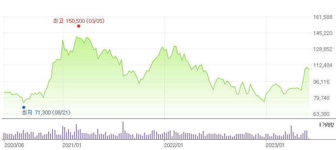 SK하이닉스 주가는 지난 2021년 150,500원을 기록한 이후 세계 경제 및 반도체 업황 침체로 인해 하향세를 보이고 있으며, 지난 6/5일 종가는 108,700원입니다.