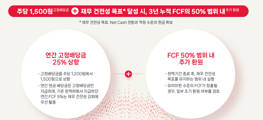 SK하이닉스 지난 '24년 11월, 기업가치 제고 계획을 발표하였습니다. 향후 주주가치 제고를 위해 연간 고정배당금을 25% 상향하여, 현재의 1,200원에서 1,500원으로 상향 조정할 계획입니다. 이후 재무 건전성 목표 달성시, 3년 누적 FCF의 50% 범위 내에서 추가 환원을 진행할 목표를 수립하였습니다.