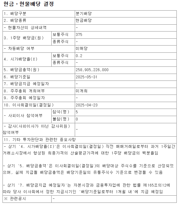 | 현대차, 2025년 1분기 배당금 확정! (1Q, 결산, 실적, 현대자동차, 주가, 배당일, 지급일, 배당락) (0) | 2025.04.24 |