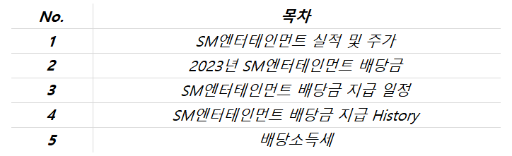 SM엔터테인먼트는 아래 일정으로 연말 결산 배당금을 지금합니다. ('23년 기준)