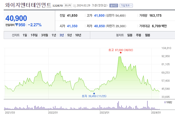 YG엔터테인먼트는 지난 '23년 중반 전고점을 기록한 뒤, 지속적으로 하향세를 보이고 있습니다. 블랙핑크 멤버들이 팀으로는 YG와 계약을 맺었지만, 개인적으로는 개별 소속사를 설립하고 있는 추세이고, 성장률도 다소 꺾인 상황이 모두 반영된 것으로 보입니다. 저점에 가깝긴 하나 어떤 반등의 모멘텀이 있을지 지켜봐야 하겠습니다.